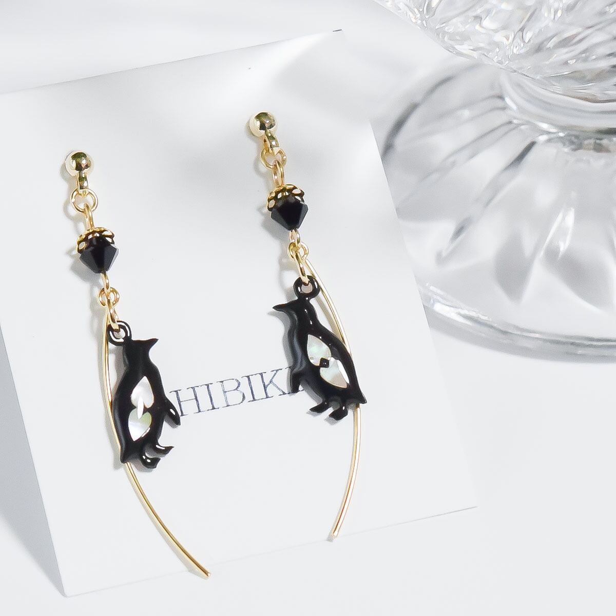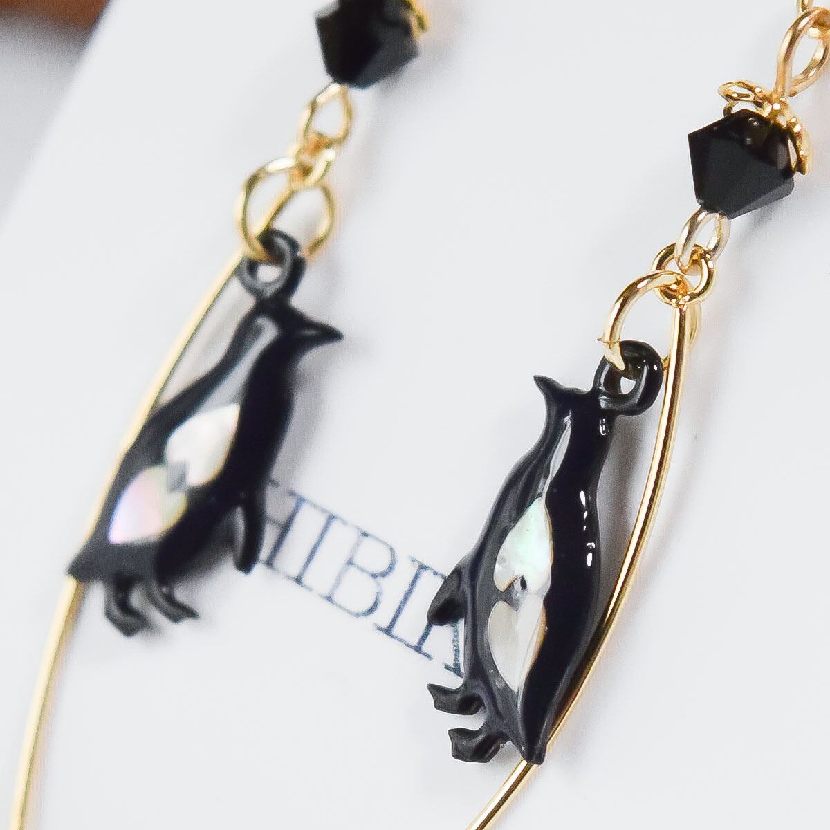 ペンギンの背中に花びら螺鈿をあしらった愛らしいピアスです。